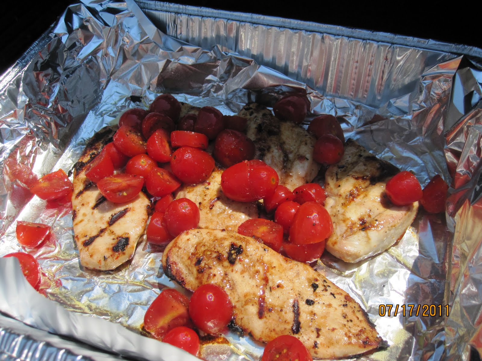 Spread the tomatoes, along with their marinade, over the grilled chicken.
